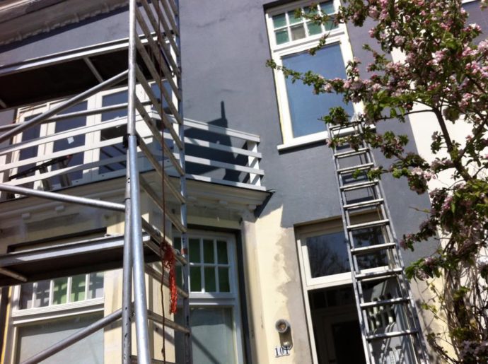 Dit is ook een opdracht waarbij de creativiteit van Jacob op de proef wordt gesteld. De gevel moest namelijk ook geschilderd maar in welke kleur?? Jacob stelde hoogglans wit voor het houtwerk en grijs voor de gevel voor. Een spannende combinatie welke wel gekozen is. Zie het fantastische resultaat!